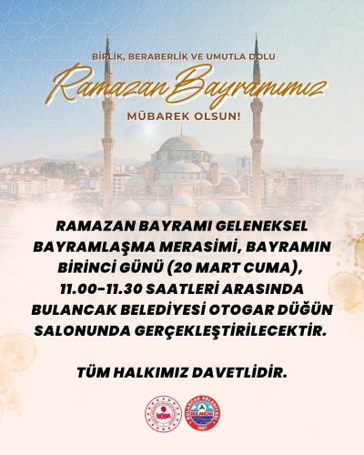 Bulancak Kaymakamlığı tarafından yapılan açıklamaya göre; Bulancak Belediyesi organizasyonunda düzenlenecek olan geleneksel bayramlaşma merasimi, bayramın birinci günü (20 Mart Cuma), saat 11.00 ile 11.30 arasında Otogar Düğün Salonu’nda gerçekleştirilecek.