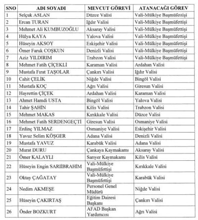 Valiler Kararnamesi Resmi Gazete’de yayımlandı. Kararname ile 19 ile yeni vali atandı, 7 ilin valisi merkeze alınarak “vali-mülkiye başmüfettişliği” görevine getirildi. Ağrı Valisi Mustafa Koç Giresun’un yeni valisi olurken, Mehmet Fatih Serdengeçti, Osmaniye’ye atandı.